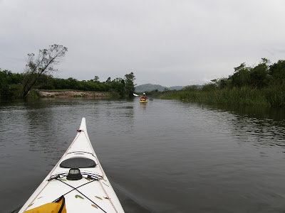 O curso do rio próximo à desembocadura no mar é o trecho com maior correnteza. À medida em que vamos remando, diminui o fluxo contrário. A paisagem inicialmente é tipicamente litorânea, com dunas de areia nas margens. Biguás aguardam pacientemente pelas boas condições de pescaria.